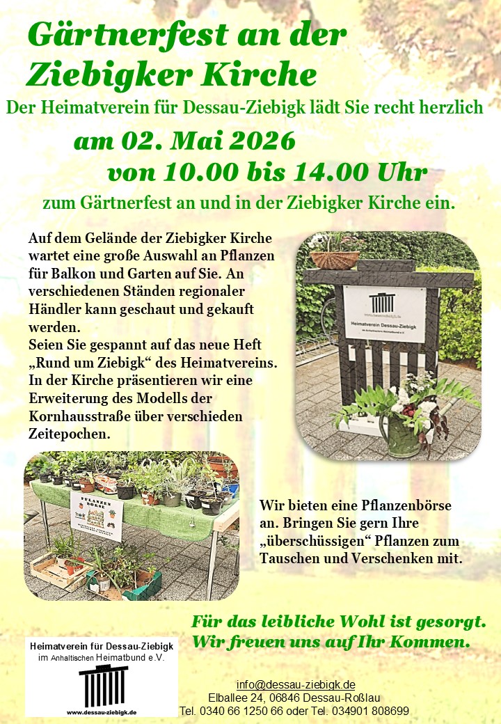 | Ziebigker Gärtnerfest | 02.05. - von 10:00 - 14:00 | Saarstraße, Kirchengelände | Heimatverein Dessau-Ziebigk |